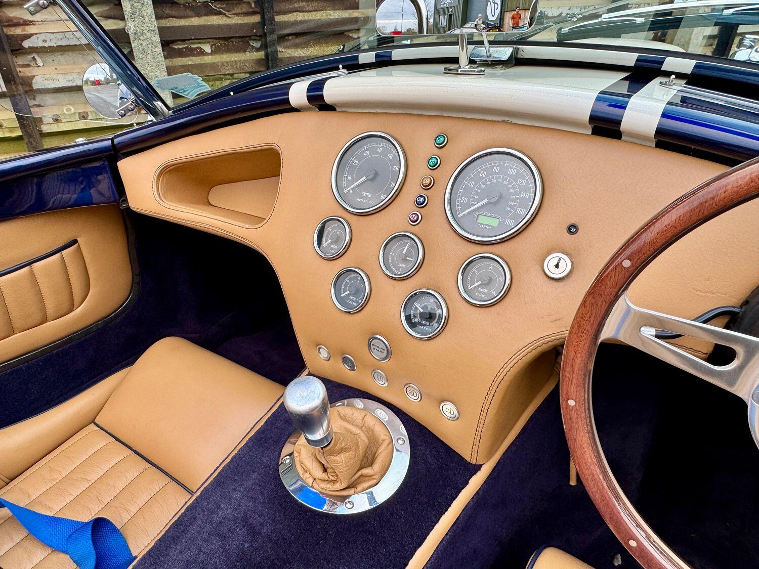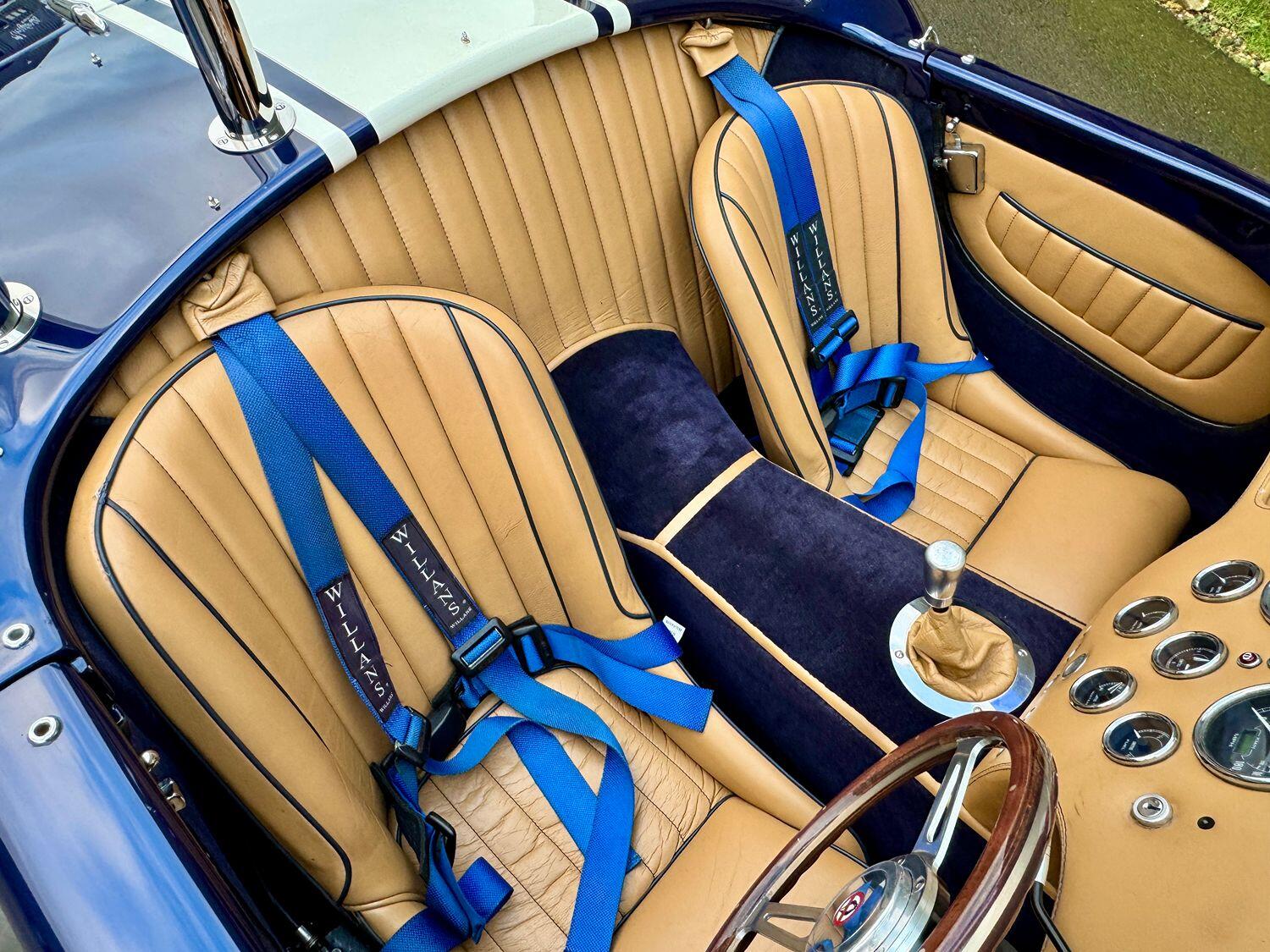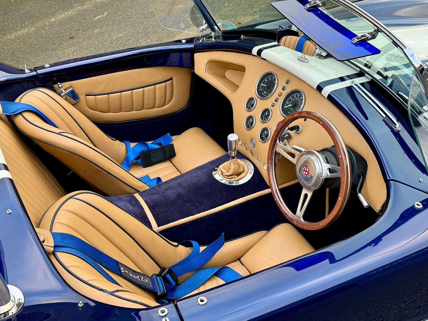 Seats, door panels (with pockets) dashboard, gear lever and handbrake gaiter all trimmed in Alex Muirhead leather. In Toffee with dark blue piping and stitching. Upgraded to deluxe interior with leather rear bulkhead in Toffee. Jaguar quality blue carpet with driver’s rubber heel pad. Willans 3 point harnesses in blue.Full Smiths ‘flight range’ instruments which are back lit Blue. 13” Motilita style wood rimmed wheel with Cobra emblem horn push.