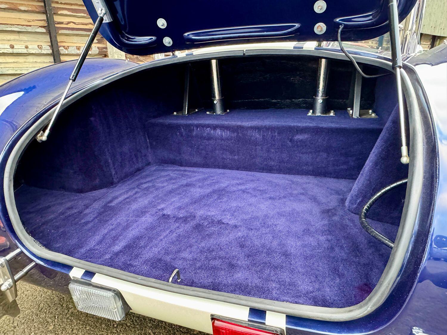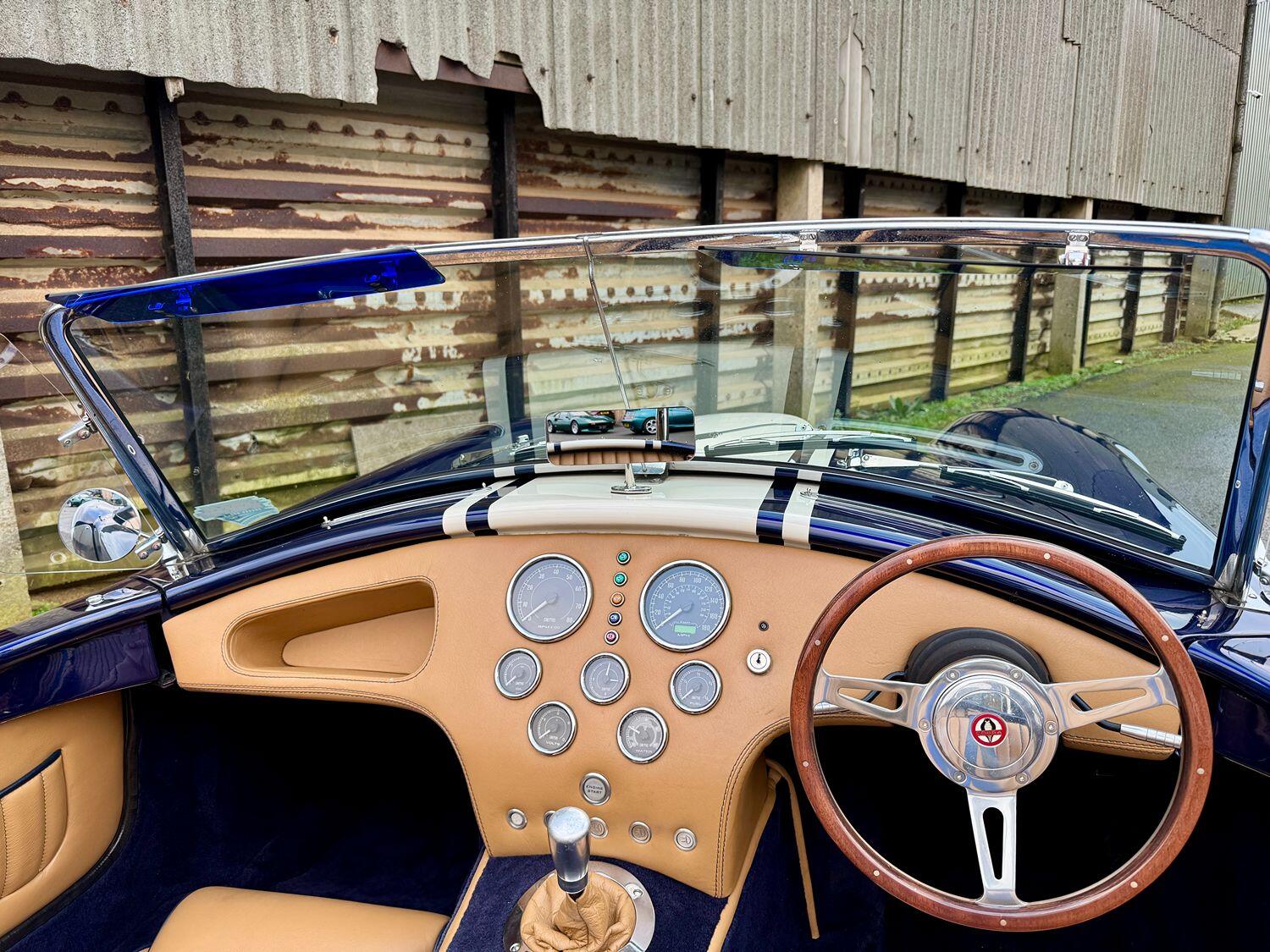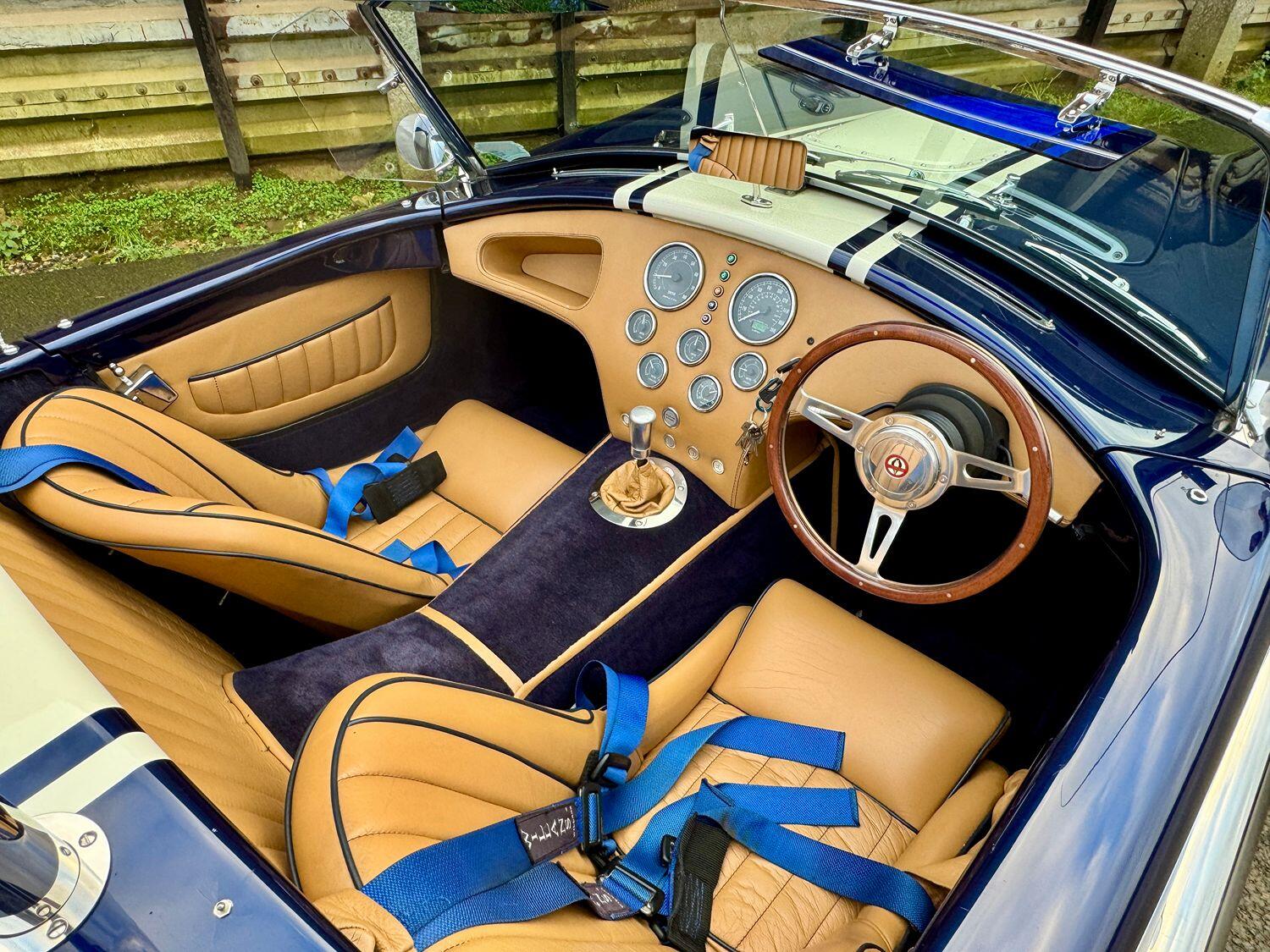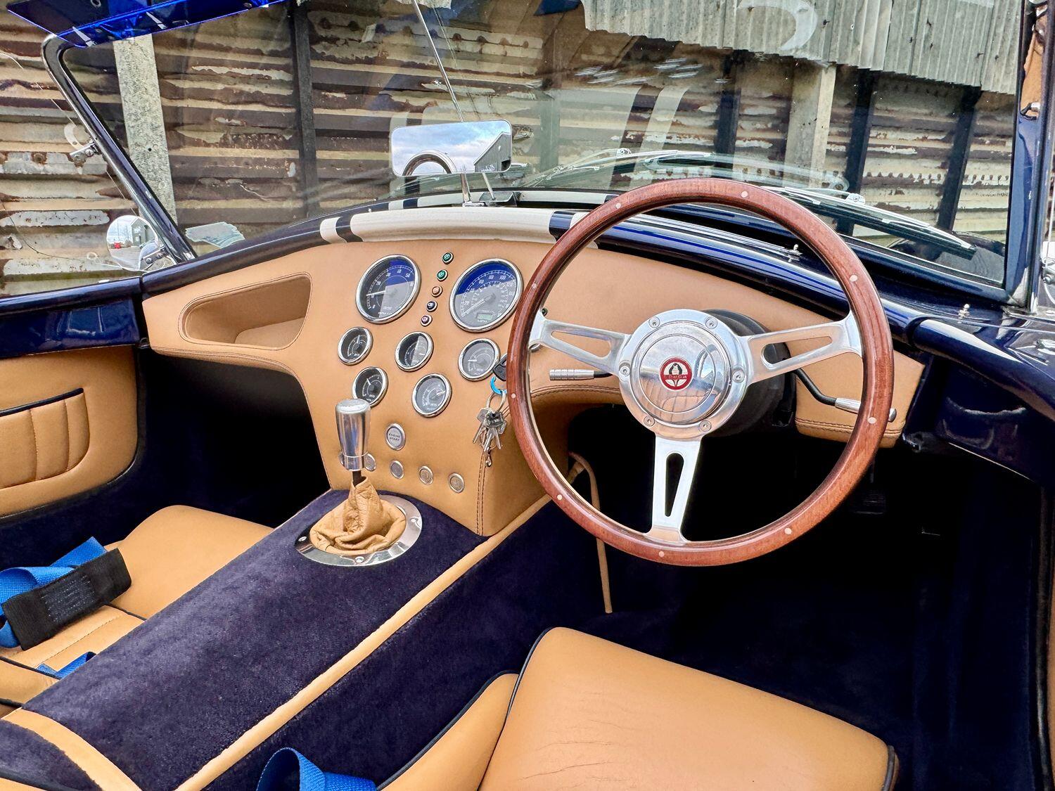 Seats, door panels (with pockets) dashboard, gear lever and handbrake gaiter all trimmed in Alex Muirhead leather. In Toffee with dark blue piping and stitching. Upgraded to deluxe interior with leather rear bulkhead in Toffee. Jaguar quality blue carpet with driver’s rubber heel pad. Willans 3 point harnesses in blue.Full Smiths ‘flight range’ instruments which are back lit Blue. 13” Motilita style wood rimmed wheel with Cobra emblem horn push.