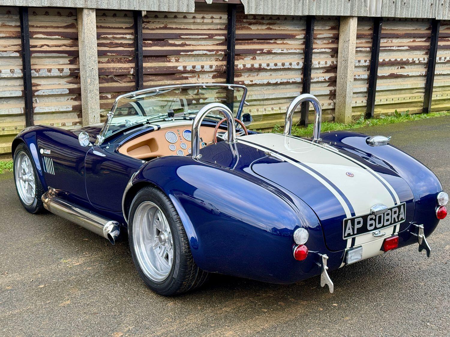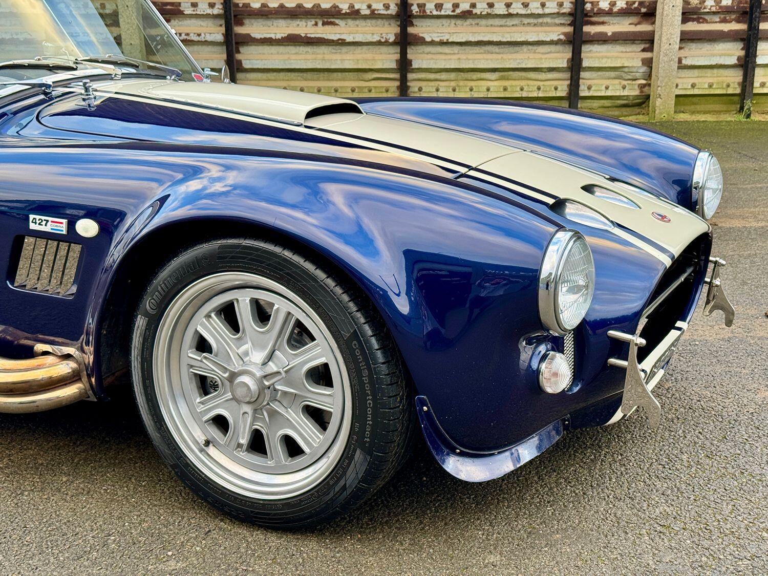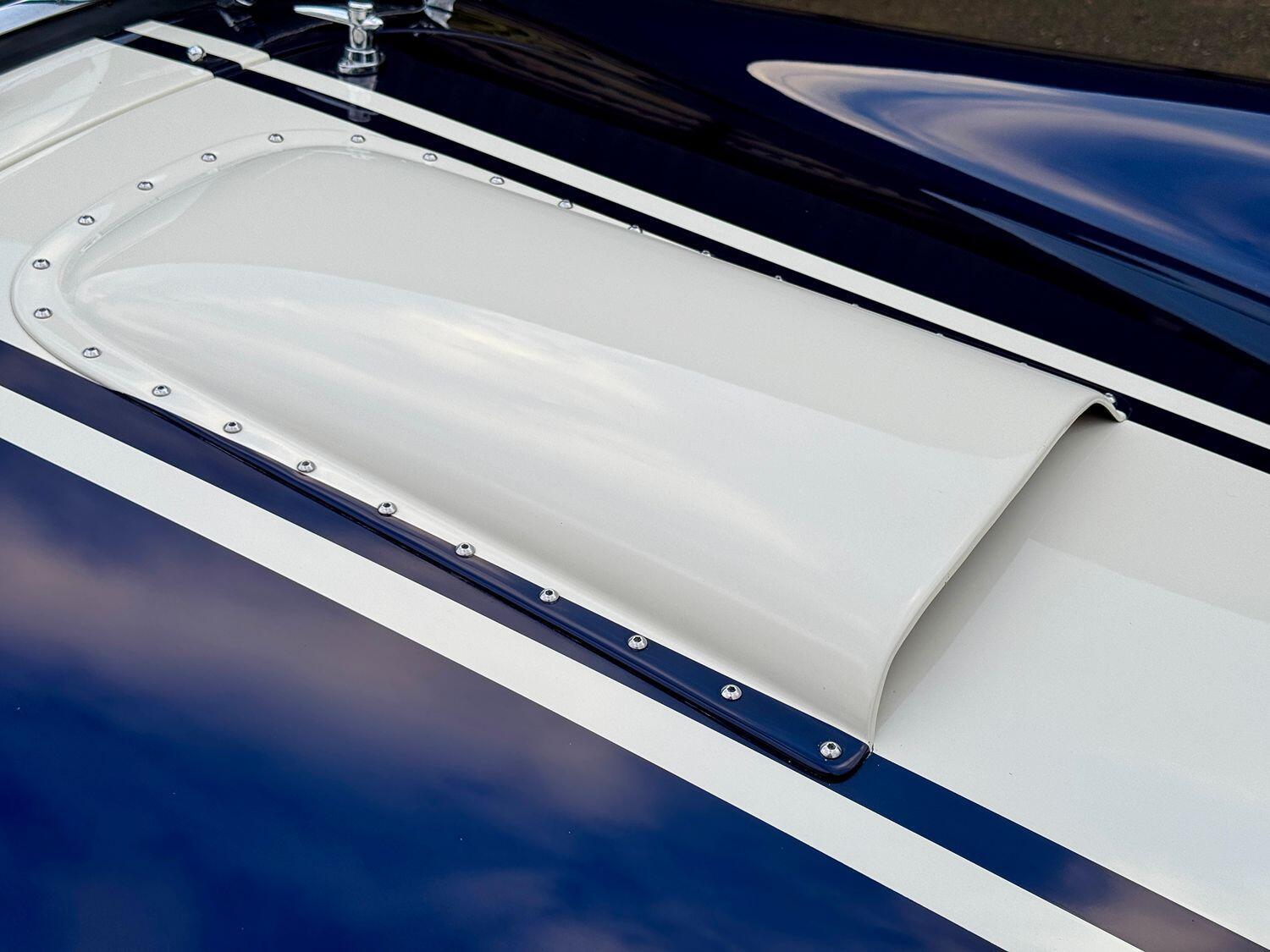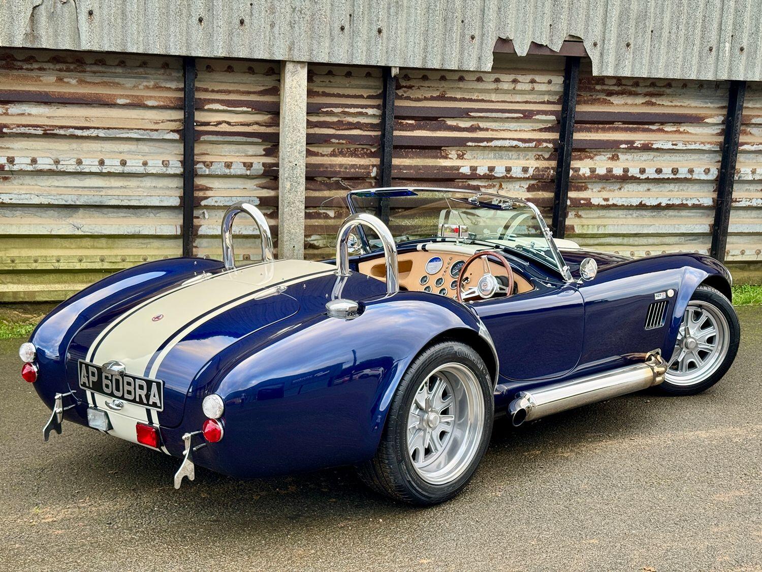A well specified and striking looking ‘GEN 2’ AK 427 finished in the stunning Ferrari Le Mans Blue with Cream stripes and an outer pin stripe. The interior is the upgraded ‘deluxe Alex Moorhead leather’ in Toffee with dark blue piping and stitching with a leathered rear bulkhead and contrasting ‘Jaguar quality blue carpet’.