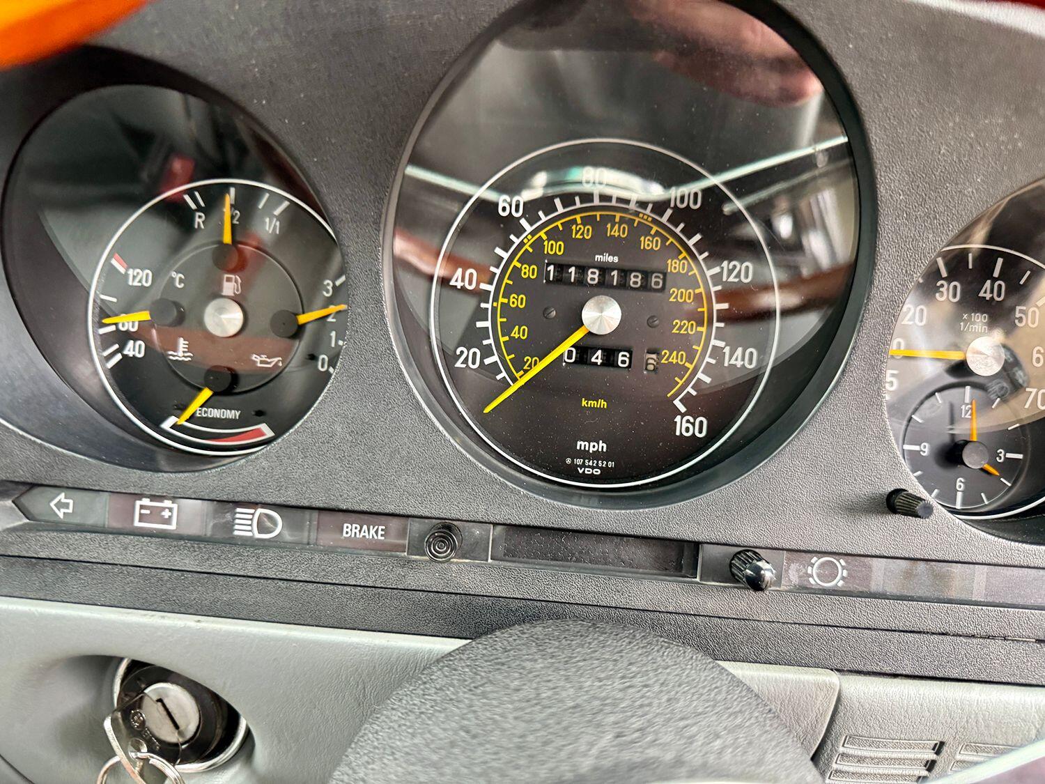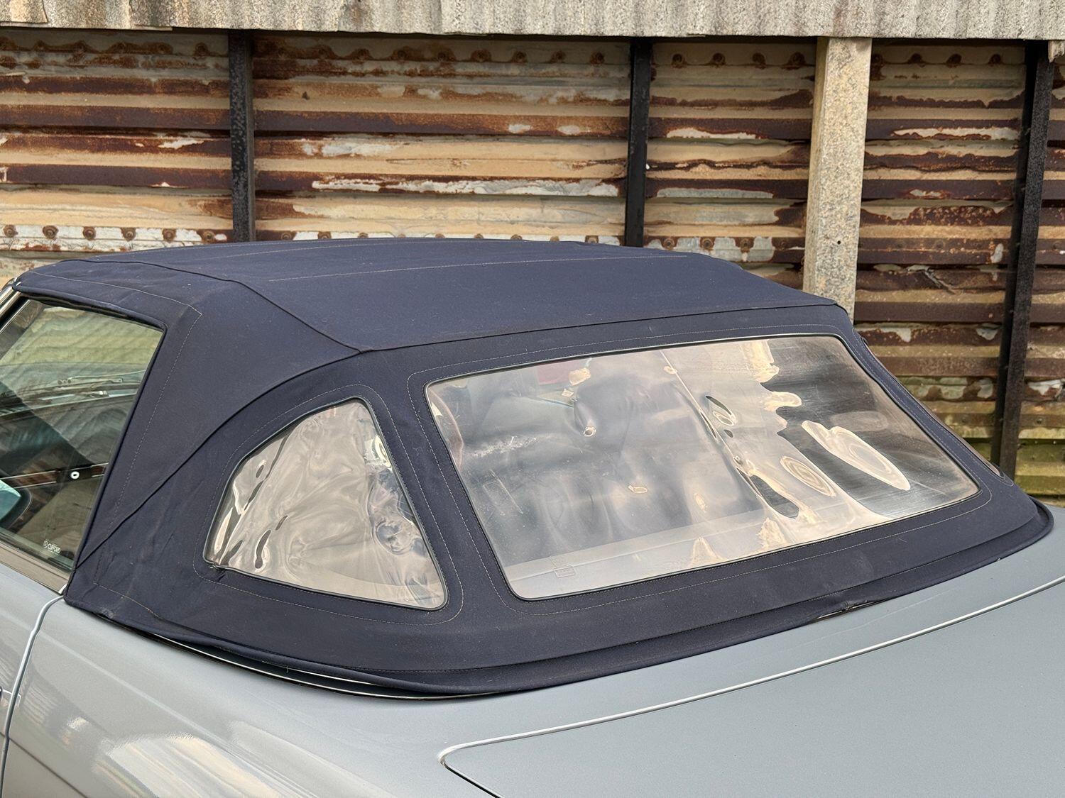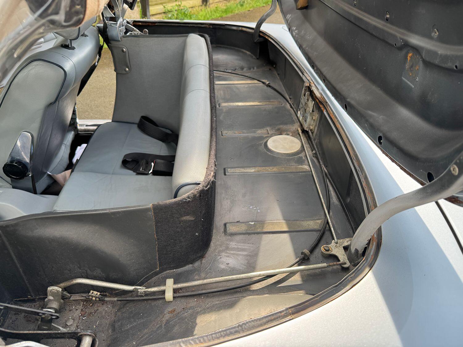 The fabric roof is in excellent order, the colour is strong with no fading and has no rips or damage including the rear windows. The hardtop is similarly good, with very little of the usual corrosion to the lower areas, and the headlining is tight and damage free. Inside there are a few signs of general wear but nothing heavy, and only a small crack to the usual area to the left of the instrument binnacle. The veneers are a later addition so in good condition, as is the steering wheel, gear knob and hand brake lever.