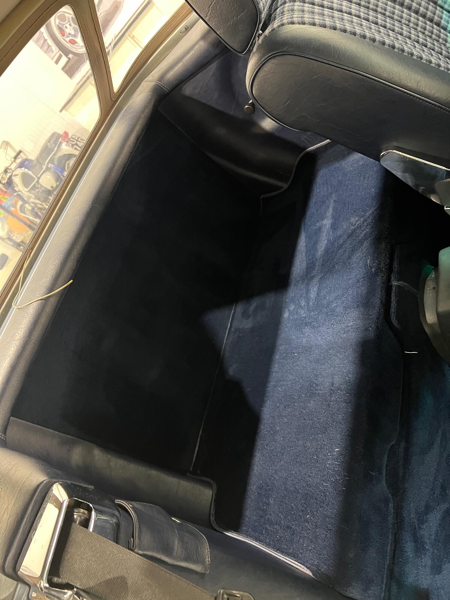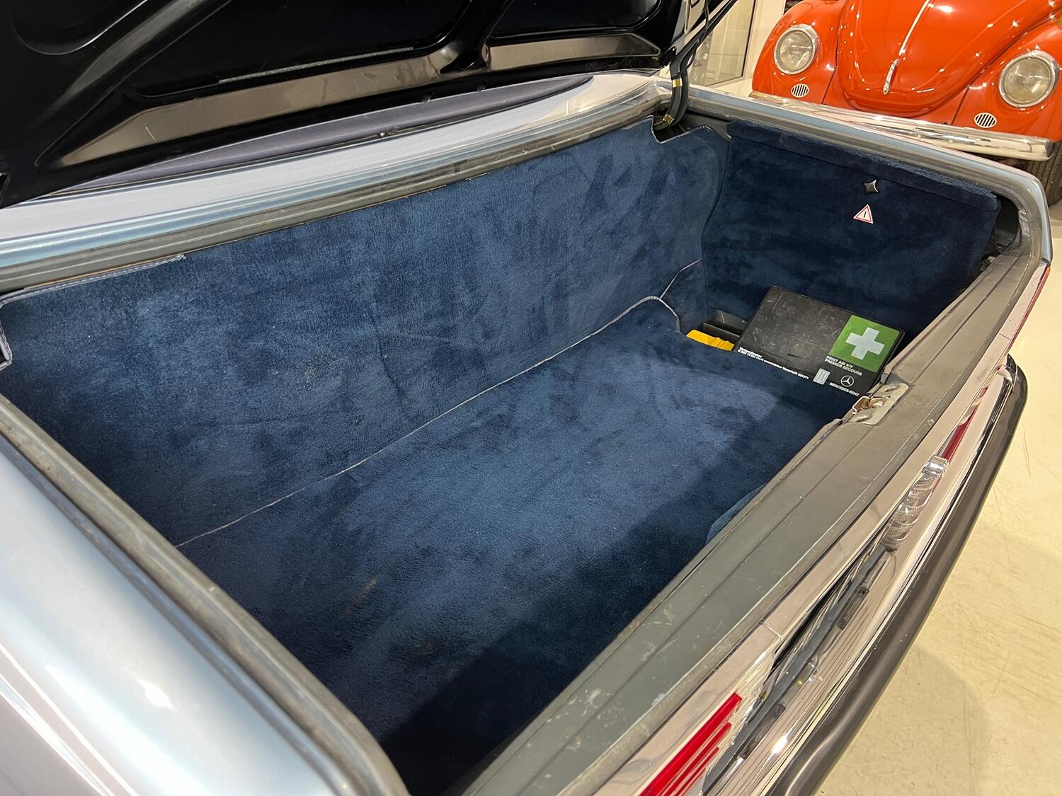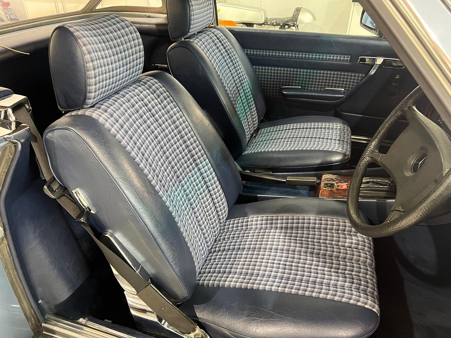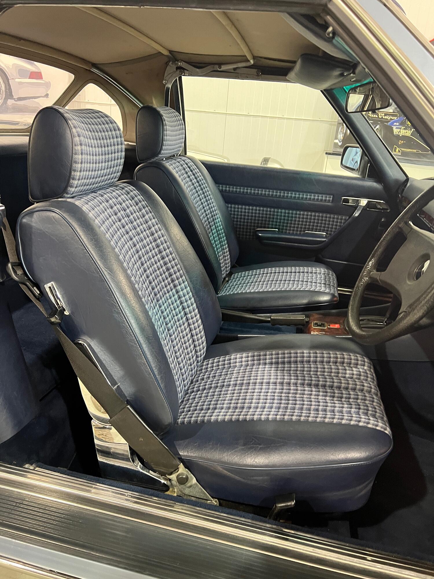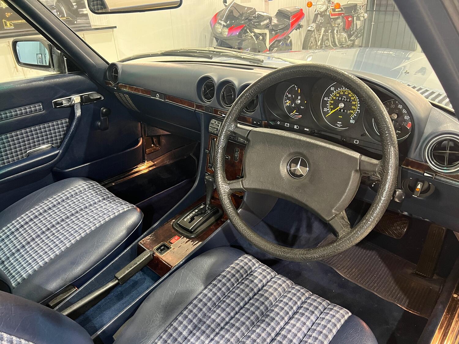 The diamond blue metallic paint looks original throughout, and is pretty much unmarked on every panel. The chrome work is free from corrosion and dents and only has very little pitting in a couple of spots. The interior defies it's age with very little wear throughout. The seats are trimmed with un-worn MBTEX cloth to the centre sections and the leather outers have only very slight creasing. All of the wood is in good order, and the carpeting in the cabin and boot in in amazing condition.